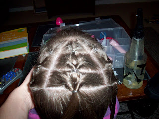 I did the same on the other side. (don't ya love how she draws and does her reading while I'm doing her hair?)